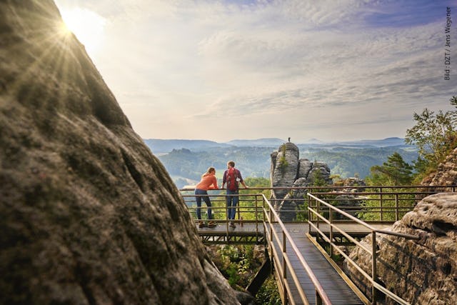 Beim Anblick des Elbsandsteingebirges südöstlich von Dresden ist schnell klar, weshalb die Region mit ihren prägnanten hoch aufragenden Felsformationen mit der Schweiz verglichen wird. Im Nationalpark Sächsische Schweiz, Deutschlands einzigem Felsennationalpark, fühlen sich Kletterer und Wanderer bestens aufgehoben. Highlights sind die Festung Königstein, die Basteibrücke mit der Felsenburg Neurathen, aber auch der Malerweg: ein Fernwanderweg, der in acht Etappen durch die Sächsische Schweiz führt. Ein Aufenthalt lässt sich zudem gut mit einem Städtetrip nach Dresden kombinieren.