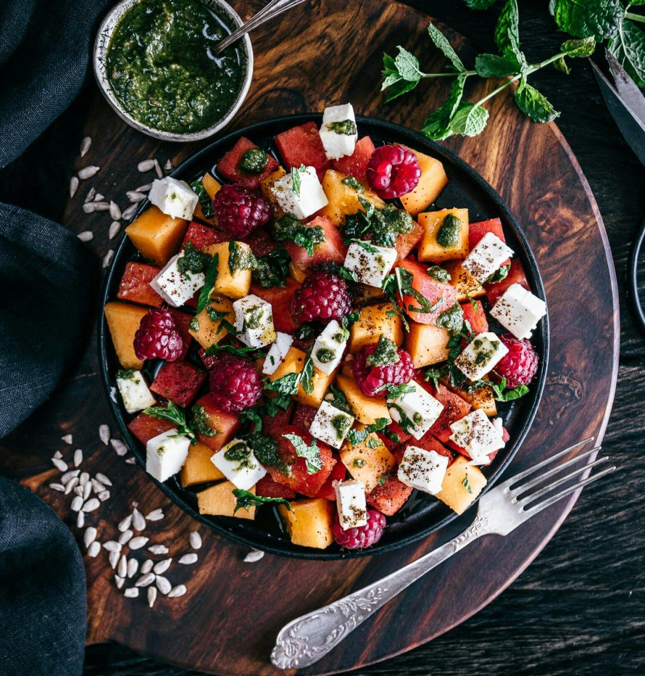 Melonensalat mit Feta, Himbeeren und Sonnenblumenkernpesto: Eine erfrischende Mischung aus süssen Früchten und salzigem Feta, abgerundet mit hausgemachtem Sonnenblumenkernpesto – perfekt für heisse Sommertage.